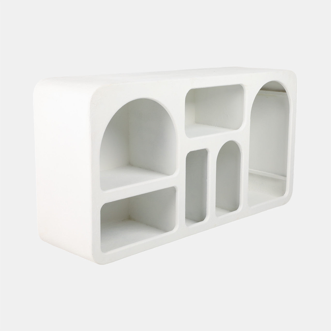 Laissez-vous emporter par un jeu de formes et de textures. Avec ses ouvertures en formes de rectangles et d’arches de tailles variées, cette console mêle modernité et originalité. Il fait plus qu’organiser : il devient un véritable élément sculptural.